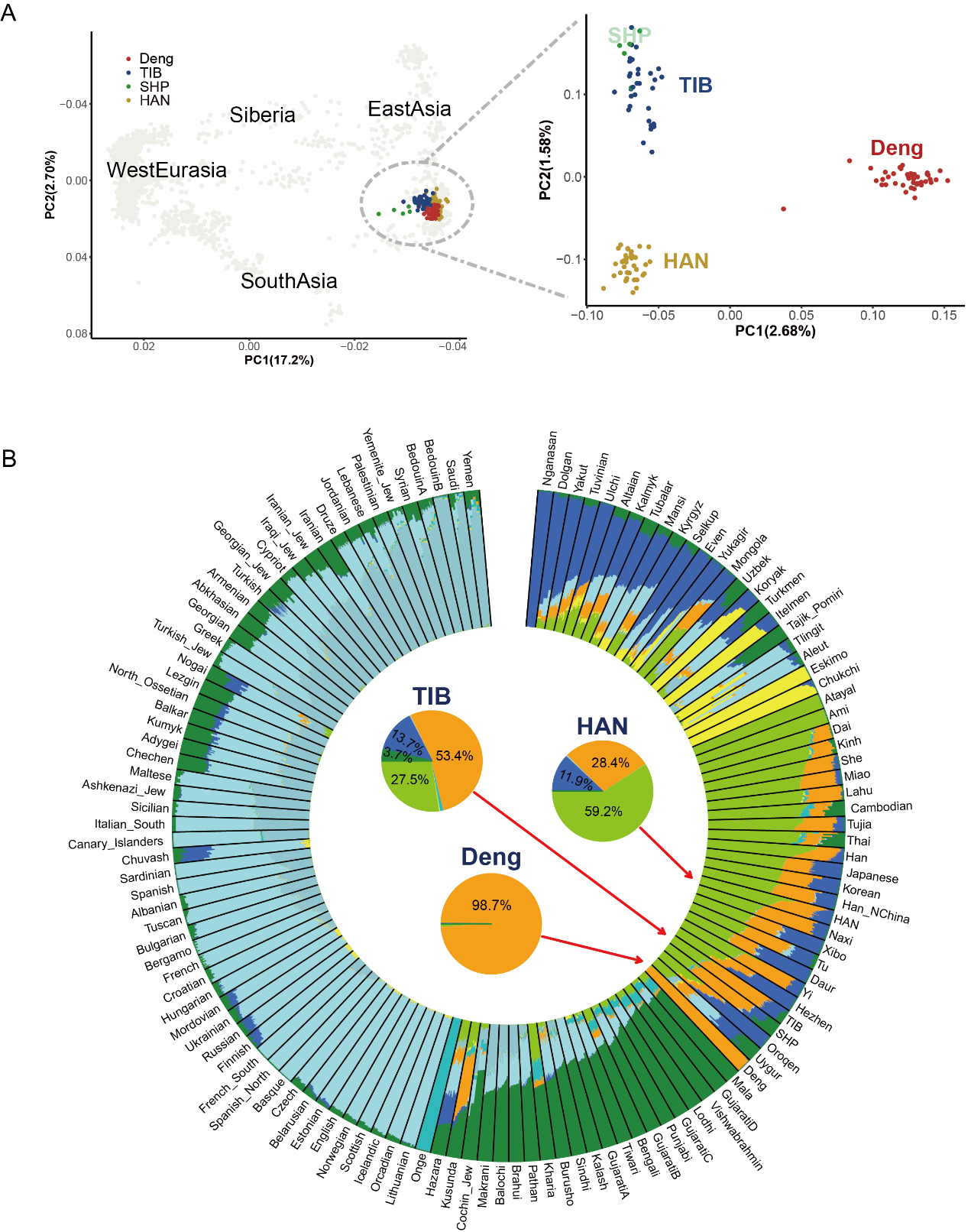 图1 | 僜人与欧亚大陆人群之间的遗传关系与遗传祖源构成