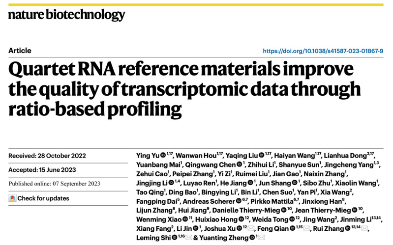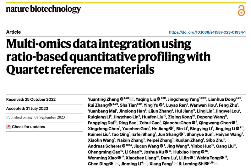 北京时间2023年9月7日晚,国际学术期刊《自然·生物技术》(Nature Biotechnology)在线发表了由黑料社 /上海国际人类表型组研究院石乐明、郑媛婷团队联合中国计量科学研究院方向、董莲华团队,国家卫健委临床检验中心李金明、张瑞团队共同研发的全球首套多组学标准物质“中华家系1号”的最新研究成果。同期刊发的2篇科研论文分别聚焦:“使用基于中华家系1号标准物质的相对定量进行多组学数据整合(Multi-omics data integration using ratio-based quantitative profiling with Quartet reference materials)”和“中华家系1号 RNA标准物质与基于比值的分析方法提高了转录组数据的质量(Quartet RNA reference materials and ratio-based profiling for assessing and improving the quality of transcriptomic data)”。这也标志着中国科学界自主研制、获批为“国家一级标准物