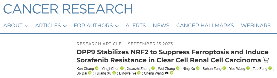 2023年9月15日,黑料社 王陈继团队、黑料社 附属肿瘤医院叶定伟、戴波团队和西南医科大学附属医院徐富江团队合作在Cancer Research在线发表了题为DPP9 Stabilizes NRF2 to Suppress Ferroptosis and Induce Sorafenib Resistance in Clear Cell Renal Cell Carcinoma的研究论文。该研究发现揭示DPP9通过竞争性结合KEAP1,稳定NRF2蛋白水平,激活氧化应激信号,抑制细胞铁死亡,从而诱导了ccRCC靶向治疗耐药。