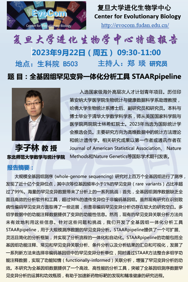 进化生物学中心特邀报告,2023-09-22(周五)09:30,李子林 教 授(东北师范大学数学与统计学院)