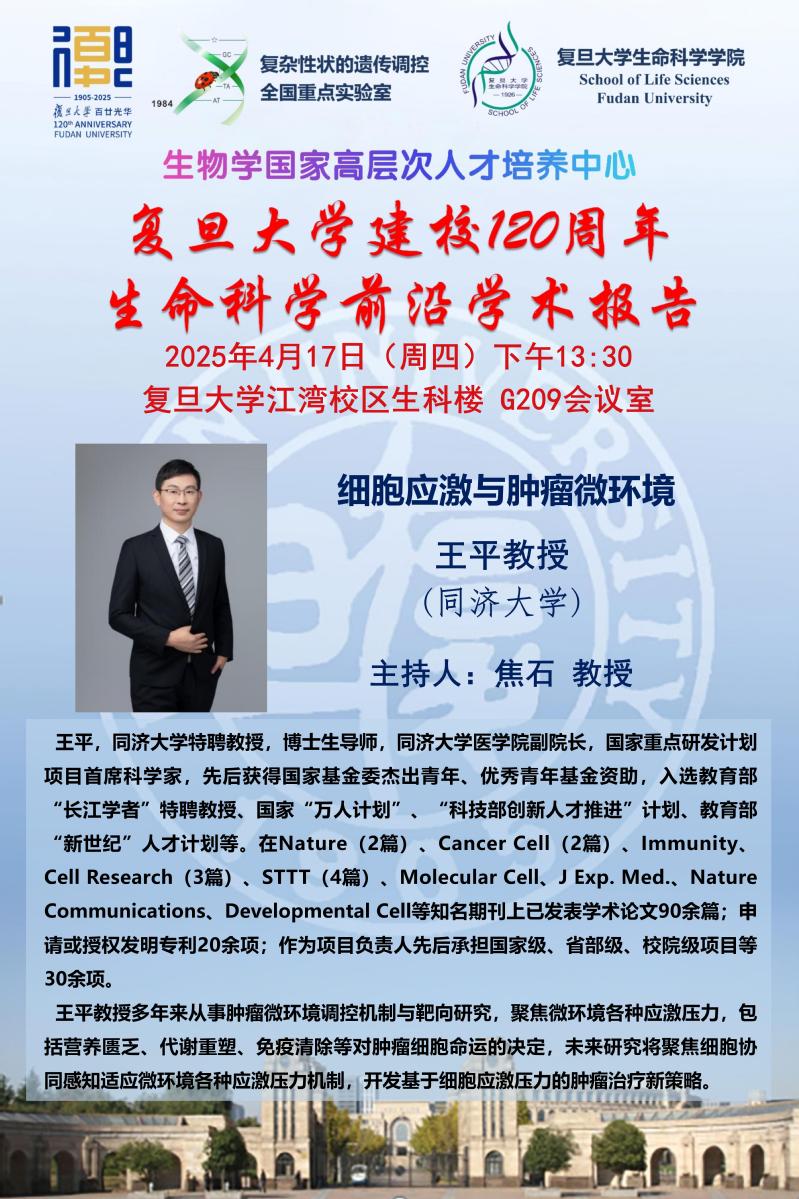 生命科学前沿学术报告--2025-4-17(周四)13:30,王平教授 (同济大学)