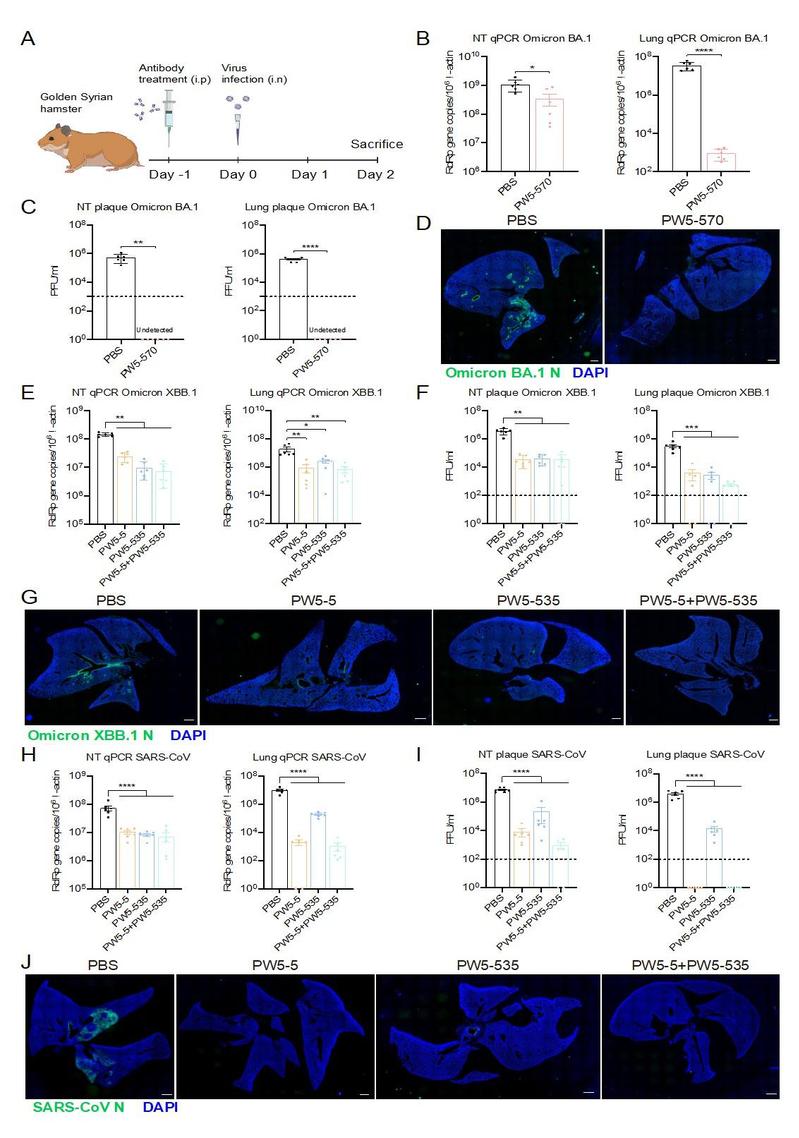 为了进一步评估抗体的体内保护作用,团队选择了病毒感染的叙利亚黄金仓鼠模型(图3A)进行研究。通过显著降低的病毒RdRp基因拷贝(图3B)以及治疗后检测不到的感染性病毒(图3C)和病毒N基因表达(图3D),证明PW5-570具有很强的体内抗新冠病毒能力。同时,选择PW5-5、PW5-535或两种抗体的组合预防性治疗SARS-CoV-2 XBB.1或SARS-CoV感染的仓鼠研究它们在体内的广谱抗病毒活性。结果表明,两种抗体及其组合均有效降低了XBB.1和SARS-CoV在仓鼠鼻甲和肺部的复制(图3E-J)。进一步证实了PW5-5和PW5-535这两种中和抗体的广谱抗沙贝病毒作用,有望成为新冠变异株以及未来可能出现的冠状病毒的候选干预药物。
