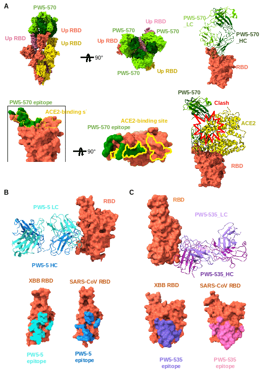 抗原-抗体复合物的冷冻电镜结构解析发现,PW5-570的表位大多与RBM重叠,且与ACE2受体之间存在明显空间位阻,从而阻止S与受体ACE2结合(图2A)。同时,确定了PW5-5(图2B)和PW-535(图2C)分别与Omicron XBB S和SARS-CoV S复合物的冷冻电镜结构。研究发现PW5-5和PW5-535结合RBD中的更保守的表位,且二者表位不重叠。同时,PW5-5诱导RBD向外移动并进入“超开”状态,导致RBD构象不稳定。而PW5-535可以阻止ACE2附着,结合RBD内部隐形表位,该表位与CR3022表位部分重叠,且PW5-535还结合与RBD相邻的SD1前端。总的来说,PW5-5和PW-535结合表位相对保守,很好的解释了它们具有广谱抗沙贝病毒中和活性的原因。