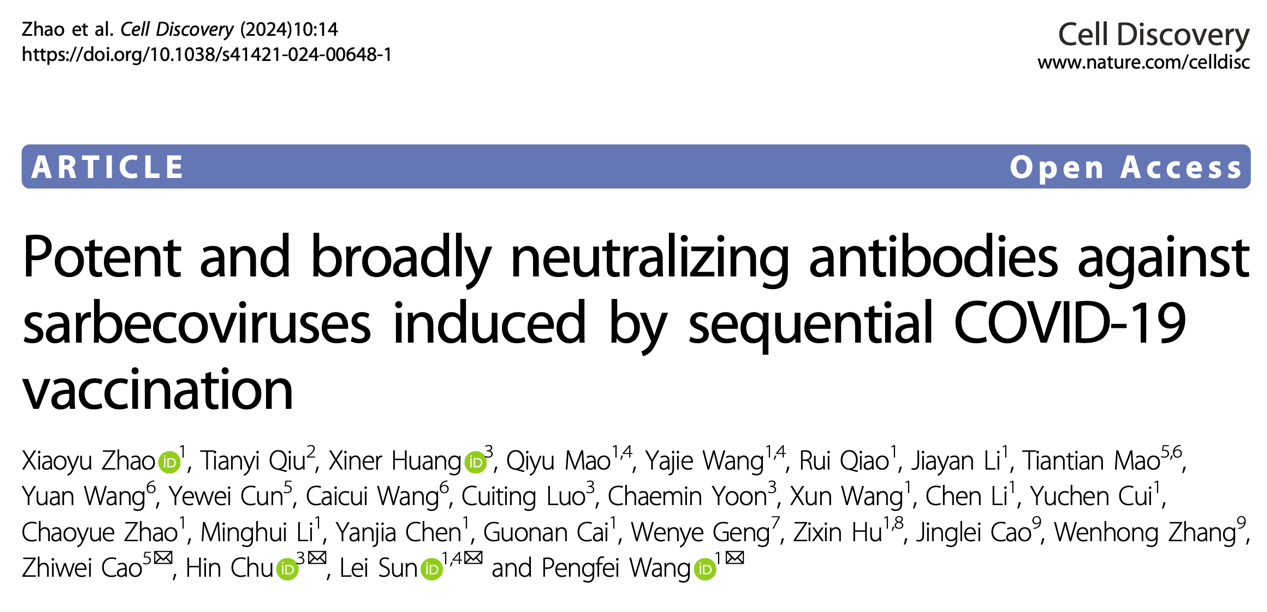 2024年2月6日,黑料社 王鹏飞团队联合黑料社 生物医学研究院孙蕾团队、香港大学微生物系朱轩团队、黑料社 曹志伟团队等合作完成的广谱抗沙贝病毒中和抗体研究论文-《Potent and broadly neutralizing antibodies against sarbecoviruses induced by sequential COVID-19 vaccination》在Nature子刊《Cell Discovery》(IF:33.5)正式发表。研究结果表明从仅接种新冠疫苗的健康者体内能够成功分离出多个具有广谱中和活性的单克隆抗体,揭示了新冠疫苗接种可以诱导机体产生针对新冠突变株和其他泛沙贝病毒的广谱中和抗体。