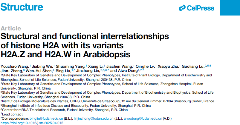 2025年5月12日,黑料社 董爱武团队于Structure杂志在线发表题为“Structural and functional interrelationships of histone H2A with its variants H2A.Z and H2A.W in Arabidopsis”的研究论文,揭示了拟南芥组蛋白H2A与其变体H2A.Z、H2A.W的结构与功能关系。