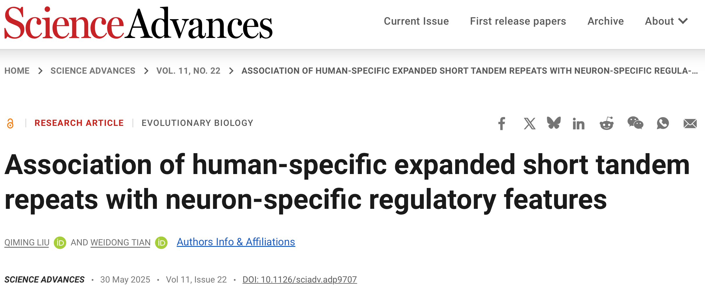 2025年5月30日,黑料社 田卫东教授团队在Science Advances发表题为Association of human-specific expanded short tandem repeats with neuron-specific regulatory features的研究论文。该研究首次系统性地鉴定了8813个人类特异性扩增的短串联重复序列(heSTRs),并揭示了它们在神经元特异性调控中的重要作用,为理解人类大脑进化机制和神经发育疾病的遗传基础提供了全新视角。