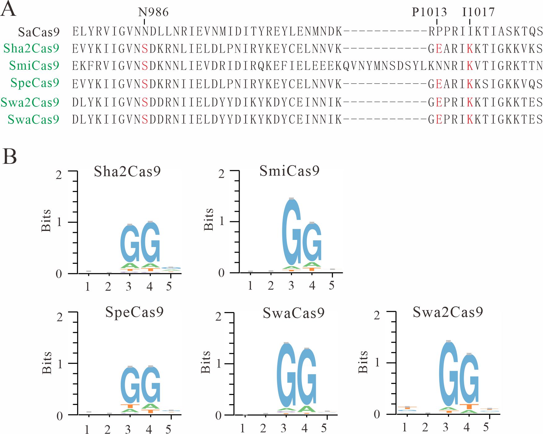 图2. (A)5个新的SaCas9同系物PI结构域的氨基酸序列。特有的氨基酸用红色标记出来。(B)5个SaCas9同系物的PAM序列。