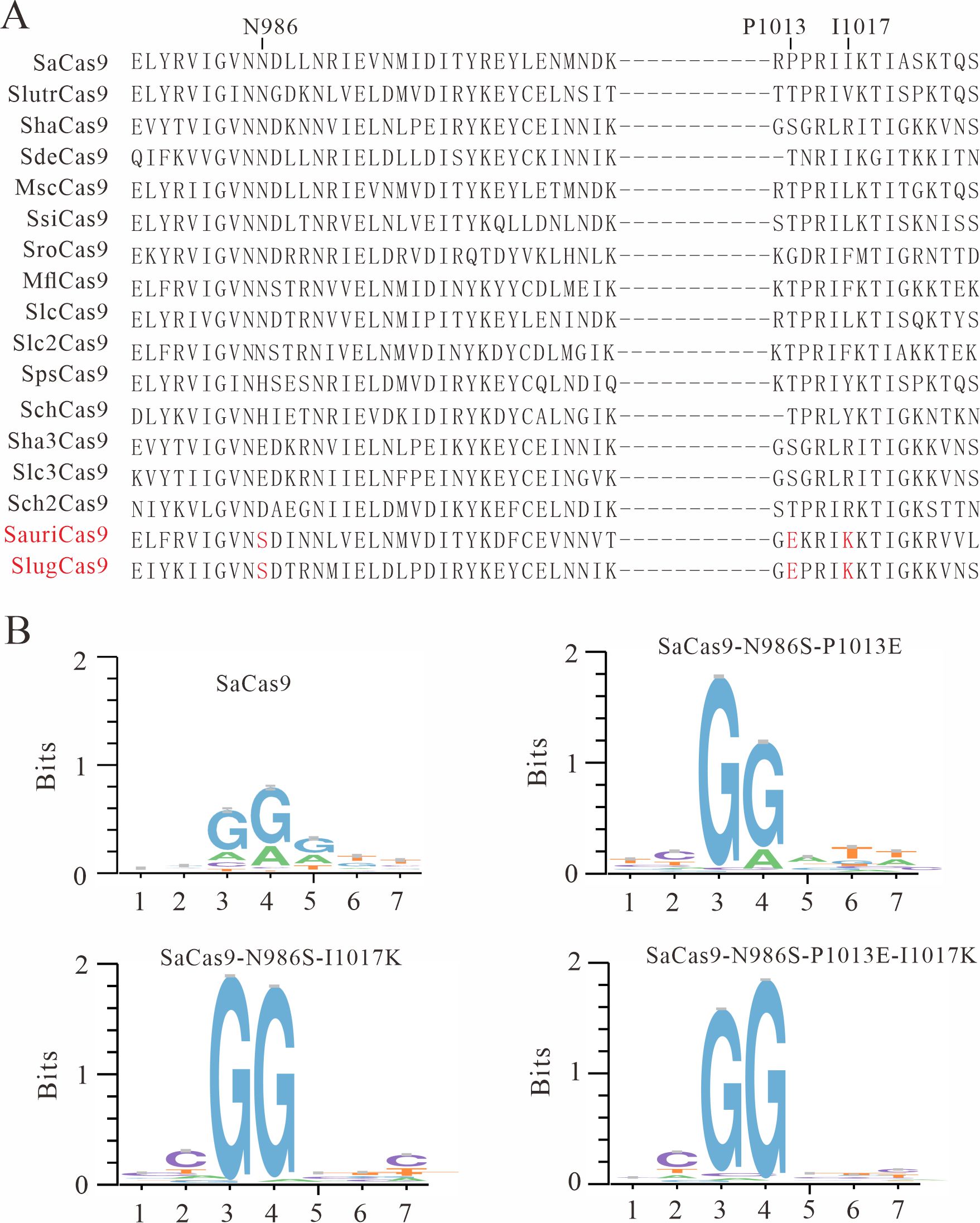 图1. (A)17个SaCas9同系物PI结构域的氨基酸序列。SauriCas9和SlugCas9特有的3个氨基酸用红色标记出来。(B)将SaCas9的2个或者3个氨基酸替换后识别NNGG PAM。