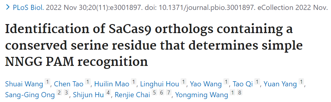 2022年11月,王永明课题组又有新突破,联合东南大学柴人杰团队和苏州大学胡士军团队在PLOS biology上发表了题为“Identification of SaCas9 orthologs containing a conserved serine residue that determines simple NNGG PAM recognition”的研究论文。该研究分析了Cas9序列和PAM的对应关系,发现识别NNGG PAM的Cas9存在3个保守的氨基酸。如果将其中两个氨基酸替换到SaCas9上面,就能使SaCas9识别NNGG PAM(图1)。