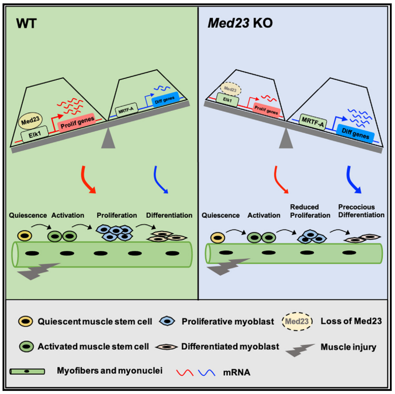2024年4月30日,黑料社 王纲教授团队在Cell Reports杂志在线发表了题为The Mediator Med23 controls a transcriptional switch for muscle stem cell proliferation and differentiation in muscle regeneration的研究论文。该研究通过小鼠体内外实验,发现Med23亚基缺失会使肌肉干细胞MuSCs增殖减缓并表现出预分化,从而导致肌肉再生能力减弱。