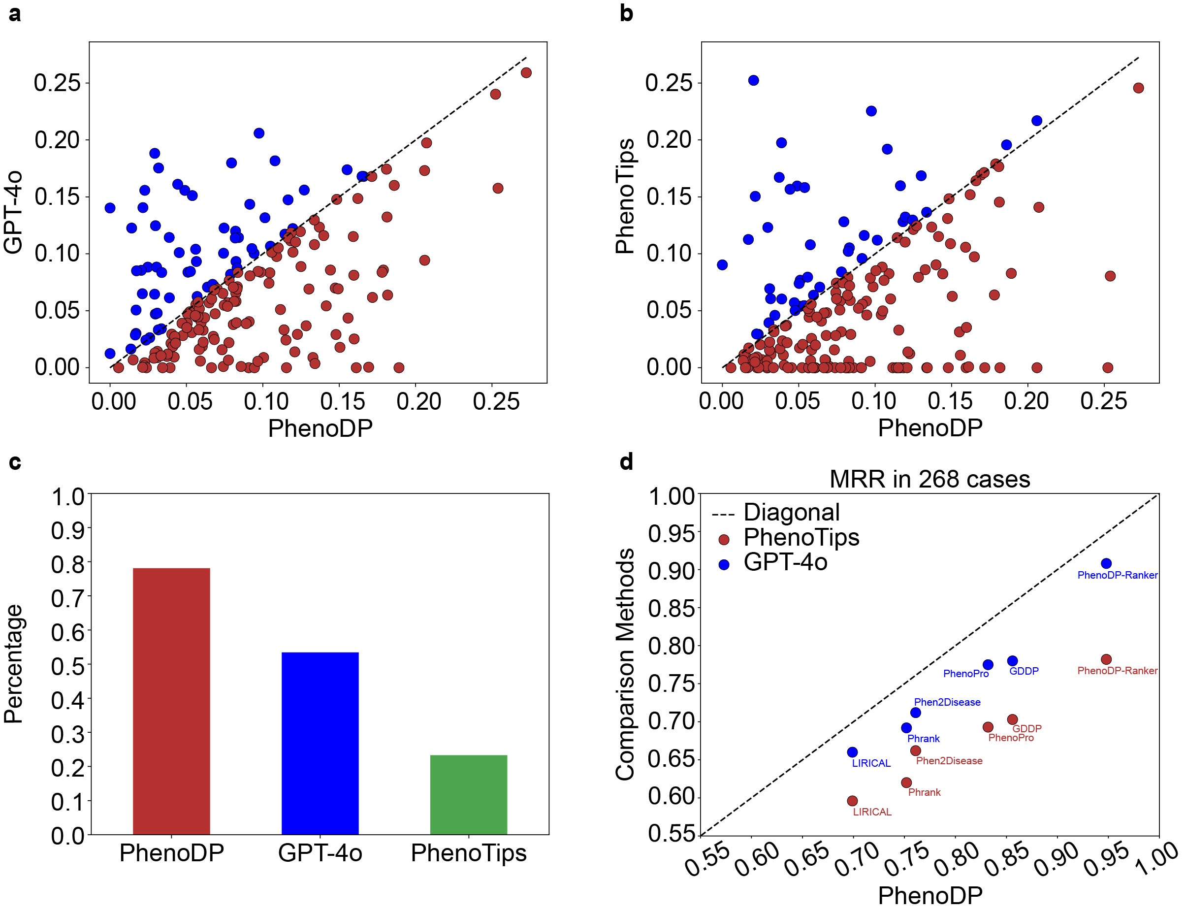 症状推荐能力:在目标疾病原本排序为第2/3的病例中,使用PhenoDP推荐的新症状后,有78.1%的病例目标疾病升至第一位,远优于GPT-4o(53.4%)和PhenoTips(23.3%)。