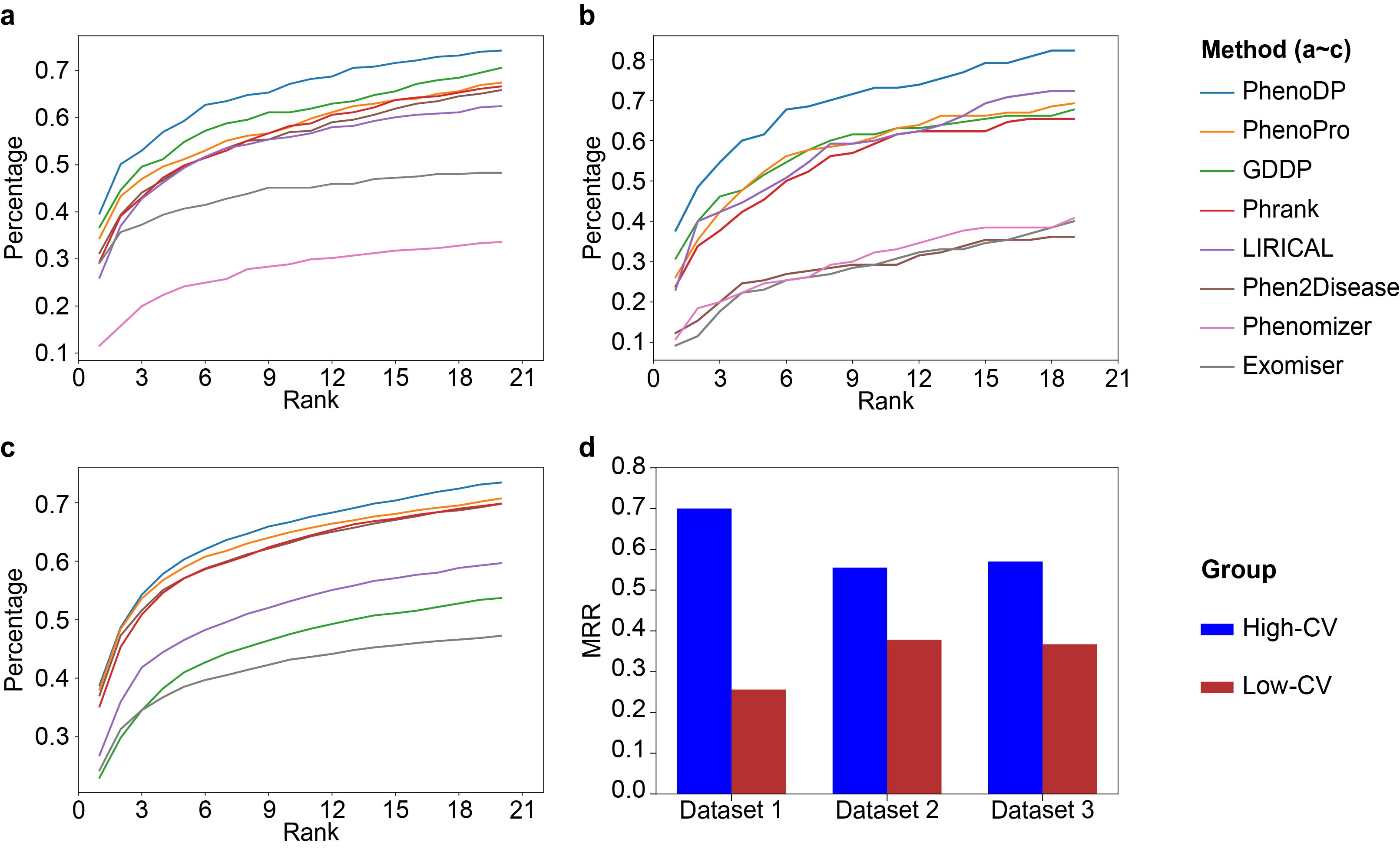 模拟数据集:在所有难度类型下,PhenoDP的Top20覆盖率和平均倒数排名(MRR)均为第一,分别比次优方法提高11.7%和12.6%。