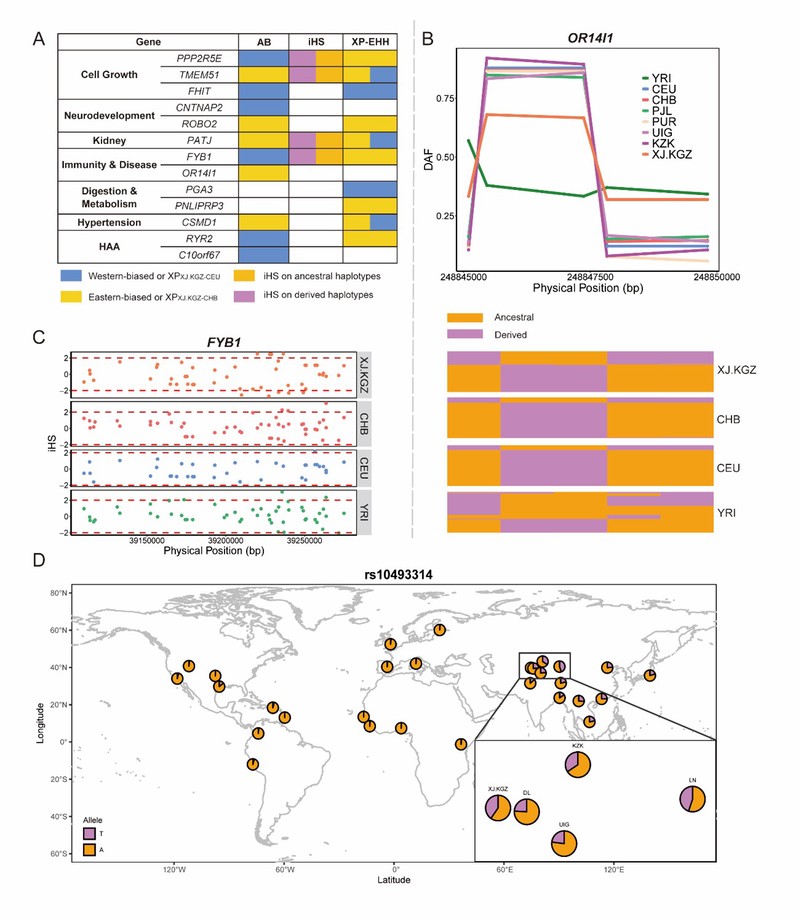 A. 柯尔克孜人群基因组中重要选择信号总结;B. OR14I1基因区域单倍型;C. FYB1基因区域的iHS选择信号;D. 世界范围内rs10493314等位基因频率分布。