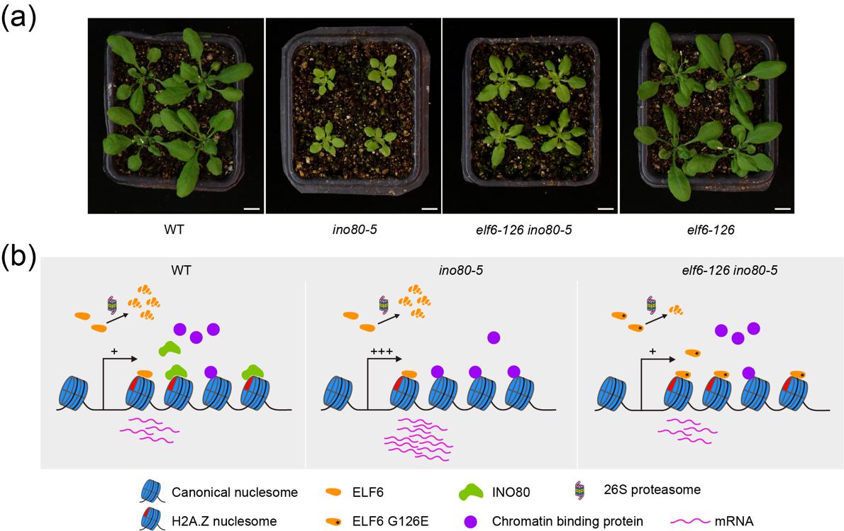苏伟副研究员与董爱武教授团队在New Phytologist期刊在线发表了题为“ELF6 mutation suppresses the dwarf phenotype of Arabidopsis ino80 mutant by modulating cell cycle progression”的研究论文,揭示了ELF6作为INO80的上游调控因子,通过调控细胞周期相关基因的染色质状态和表达水平,有效回复了INO80缺失所导致的生长缺陷,为深入理解植物表观遗传调控机制提供了新的视角。
