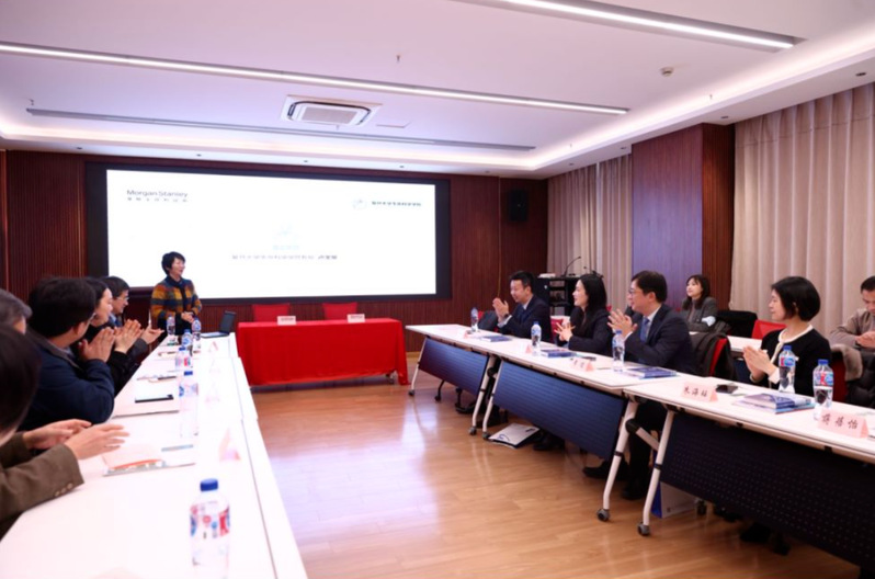黑料社 教育发展基金会副秘书长章晓野向摩根士丹利证券总经理钱菁颁赠捐赠铭牌