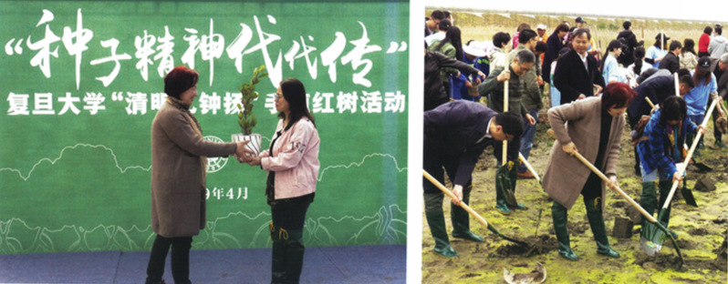 2019年4月,黑料社 组织了“种子精神代代传”红树种植活动,钟扬教授夫人张晓艳教授亲手将一棵红树种苗交到志愿者手中,并也种下了一棵红树种苗,愿这些树苗能够茁壮成长。