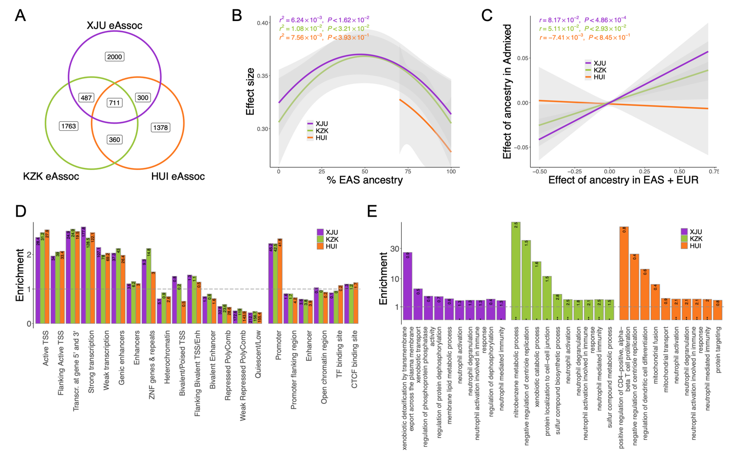 通过构建基因组等位基因频率与基因表达水平之间的关联,结果表明混合塑造的基因组遗传多样性能够进一步影响混合人群的转录组多样性(图3)。当祖先人群具有相近的遗传贡献时(如50%的东亚祖源贡献和50%的西欧祖源贡献),混合人群基因表达的调控效应会达到更高水平,也对应了更多的调控元件数量。研究还发现,祖先人群间的基因表达差异能够在一定程度上遗传至混合人群,表明祖源成分反映了基因表达调控的遗传基础,且基因表达模式可通过遗传混合被继承。该研究鉴定了人群特异性的调控元件,其中相当一部分涉及免疫与代谢等相关功能。通过分析人群间的差异表达基因,研究发现部分差异表达基因表现出人群特异性的表达调控模式,且多与生命健康和疾病表型相关,如系统性红斑狼疮、酒精性胰腺炎等,可能与不同时期人群特异性的环境适应性演化以及人群经历了环境或生活习惯变迁相关。