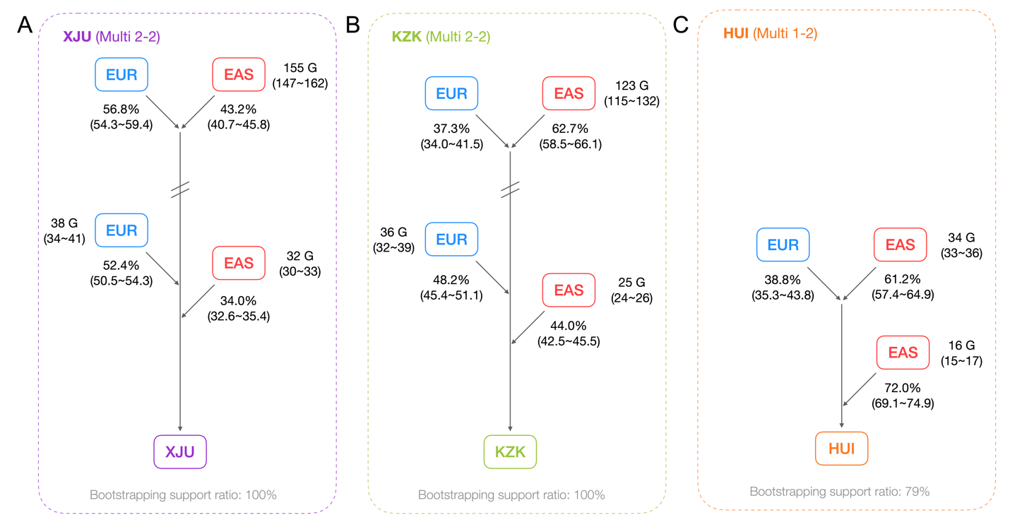 该项研究首先基于哈萨克、维吾尔族和回族人群的基因组数据全面地构建了各个人群的遗传结构与群体历史。三个人群均具有复杂的混合模式。为便于建模分析,将混合模式简化为二元混合模型,哈萨克、维吾尔族和回族的遗传结构分别可以解析为56.1%–65.3%、42.2%–58.0%、83.6%–98.0%的东方祖源成分,其他祖源成分则来自于西方祖先人群。哈萨克人群经历的两次最显著的群体融合事件分别发生在距今约3000年和750年前,维吾尔族人群的混合时间则相对较早(分别为距今约3750年和750年前),而回族人群的时间则较为近期(分别为距今约900年和400年前)(图1)。