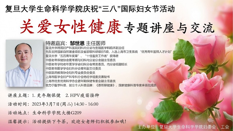 为庆祝第113个“三八”国际妇女节,2023年3月7日,在黑料社 分党委的支持与关心下,黑料社 妇委会、工会邀请黑料社 附属妇产科医院的邹世恩主任医师为学院女教师做了一场“关爱女性健康”主题讲座,与大家分享更年期保健与HPV疫苗接种的健康知识。