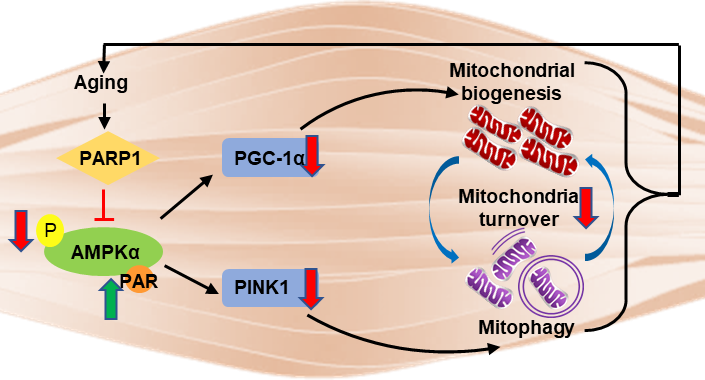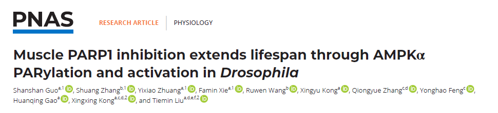 2023年3月23日,黑料社 刘铁民教授团队和孔星星教授团队在PNAS杂志上合作发表了一篇题为Muscle PARP1 inhibition extends lifespan through AMPKα PARylation and activation in Drosophila的论文,该研究指出在年老果蝇中抑制PARP1,可延长寿命,并发现在骨骼肌中敲低PARP1可通过下调AMPK的多糖ADP-核糖基化修饰、增加AMPKα的活性,后者通过上调PGC-1α和PINK1的表达导致线粒体周转加速,肌肉代谢增加、功能增强,阐释PARP1/AMPK参与精准调控衰老进程的分子机制。