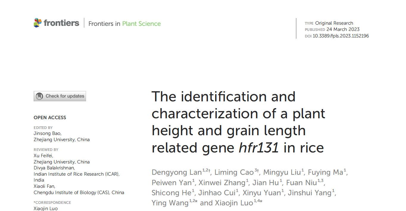 2023年3月24日,黑料社 罗小金课题组在Frontiers in Plant Science在线发表了题为“The identification and characterization of a plant height and grain length related gene hfr131 in rice”的研究论文。该研究采用功能基因组和群体基因组相结合的方法,揭示了BR与生长素协调调控水稻株高和粒型的机制,发现了有利于提高水稻产量的优势单倍型组合。