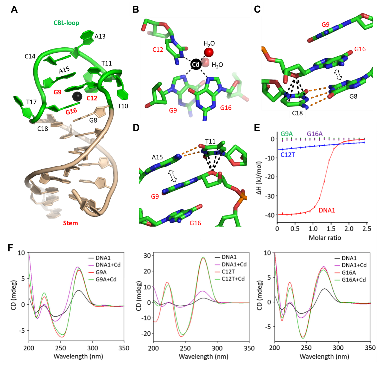 本研究中的Cd2+结合的DNA适配体(简称DNA1)全长为25个核苷酸,可分为两个区域:常规的碱基配对区域(Stem)以及Cd2+特异性结合的loop(CBL-loop)区域。其中Stem区域的长度可变,而CBL-loop则由9个核苷酸碱基组成。DNA1的整体结构与Cd2+模式均不同于其他重金属离子适配体,DNA1的CBL-loop采取了一种两侧扭转的构象,其中G9、C12与G16核苷酸的碱基平面上的N原子直接参与了Cd2+的结合。与两个水分子一起,形成了五配位的Cd2+结合模式。定点突变、圆二色谱实验和等温滴定量热实验均证明G9、C12以及G16位碱基对DNA1结合Cd2+至关重要。