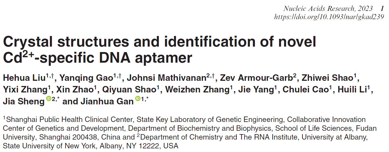 2023年4月4日,黑料社 甘建华课题组和纽约州立大学盛佳课题组合作在Nucleic Acids Research上发表了题为“Crystal structures and identification of novel Cd2+-specific DNA aptamer”的文章,报道了Cd2+与四种DNA适配体复合物的晶体结构,首次阐明了DNA适配体识别Cd2+的结构基础。