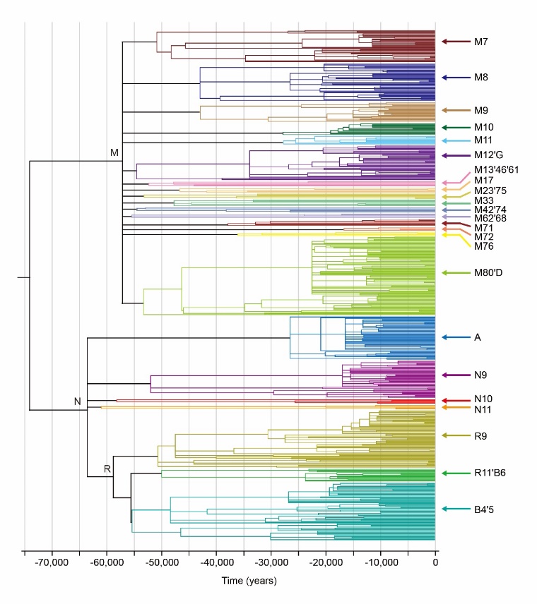 该研究结合了分子进化和群体遗传学研究方法,整合了海量的线粒体基因组数据,绘制了东亚人群具极限精度的线粒体DNA进化树(图1),该进化树可为线粒体DNA在中国人群的分子人类学、医学以及法医学相关领域中的应用奠定重要基础。该项工作也着重研究有害突变在现代人群中的遗传规律,为进一步研究突变负荷在生物医学领域中的价值提供依据。