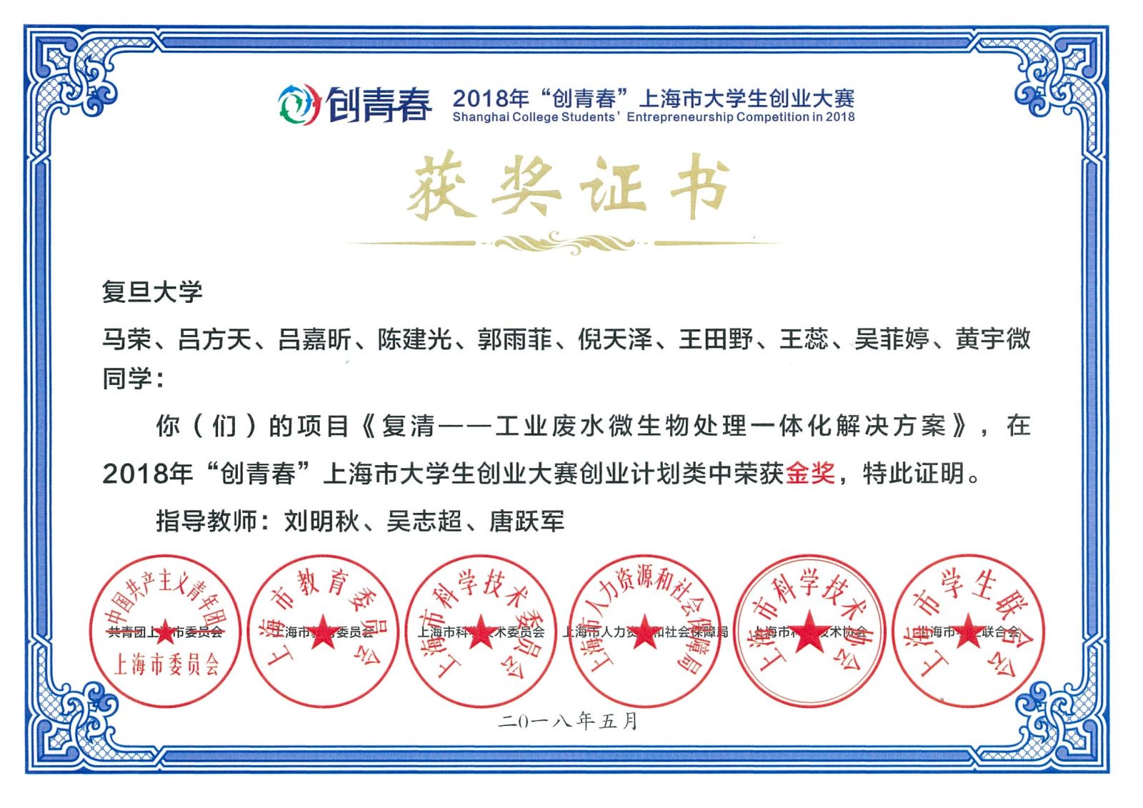 我院吕嘉昕同学作为团队成员之一参加2018“创青春”上海市大学生创业大赛,以“复清—工业废水微生物处理一体化解决方案”获得创业计划类金奖,刘明秋副教授等三位教师荣获该项目优秀指导教师称号。该项目旨在解决工业生产产生的废水处理问题,具有很重要的现实意义和转化前景。
