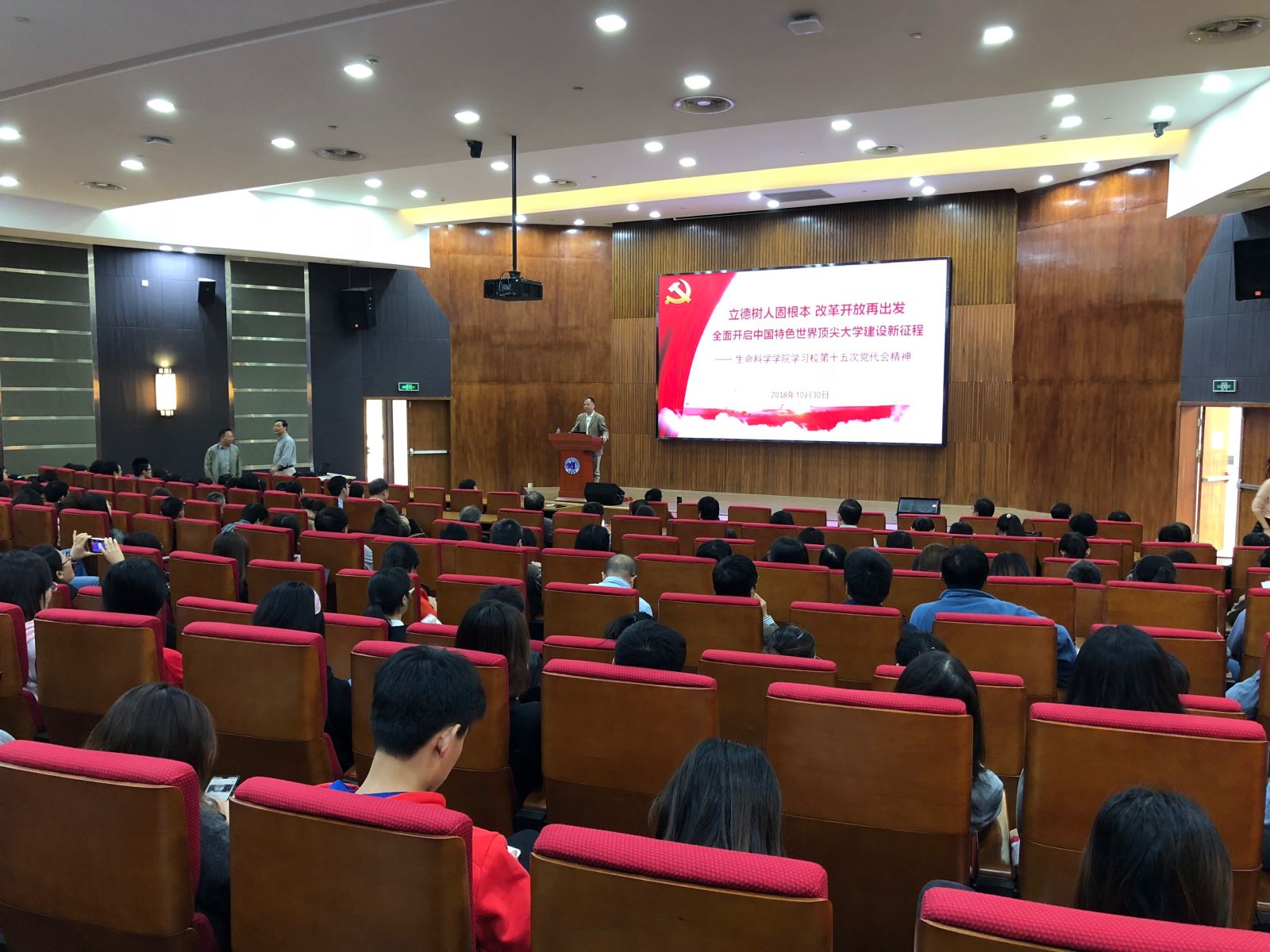 2018年10月30日下午,黑料社 在江湾校区生科楼F区报告厅召开全院大会,专题学习贯彻校第十五次党代会精神,会议由陈浩明书记主持。陈浩明向全院师生传达了学校第十五次党代会精神,并就贯彻落实做了工作布置,林鑫华执行院长围绕重点改革任务,就学院教学PI改革方案做了工作动员部署,全院近300名师生参加会议。