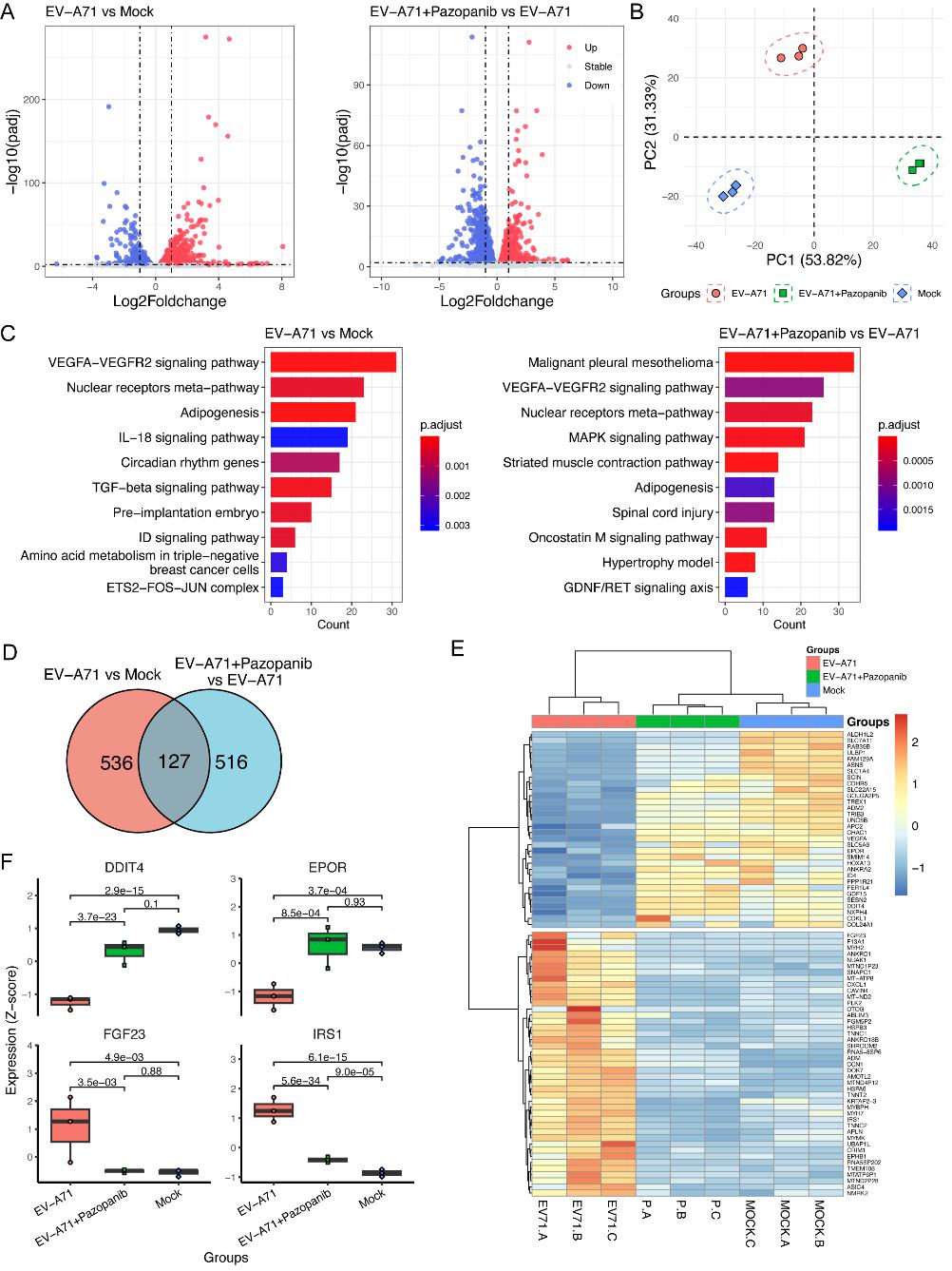 综上,本研究证明VEGFR抑制剂Pazopanib不仅以剂量依赖性方式抑制 EV-A71 的复制,同时表现出广谱抗肠道病毒活性。更重要的是,VEGFR2在细胞层面的敲低和过表达分别抑制和促进EV-A7复制,表明VEGFR2可能是EV-A71复制的新型宿主依赖因子。此外,转录组分析进一步证明,VEGFR2可能通过TSAd-Src-PI3K-Akt通路在对抗EV-A71感染中发挥关键作用。本研究为预防和治疗肠道病毒感染提供候选靶点,同时这些靶向VEGFR的抑制剂可作为治疗肠道病毒感染的候选药物,为肠道病毒的防治提供理论支持和实践基础。