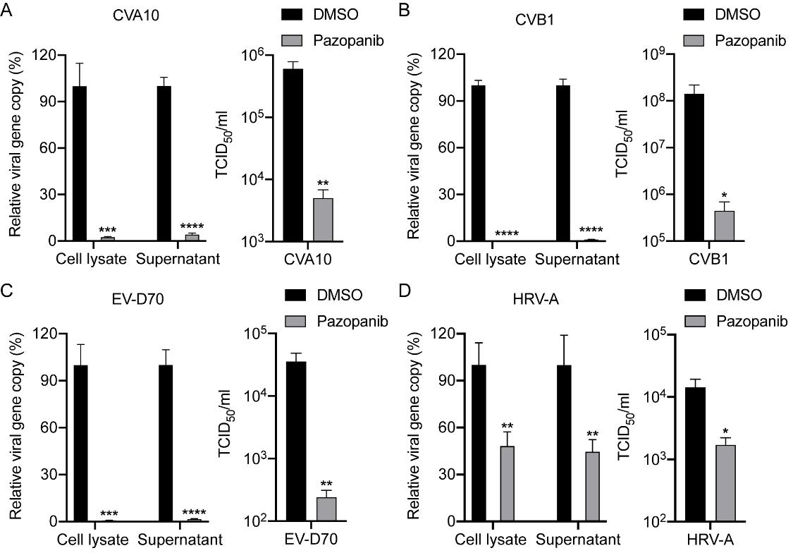 同时,通过多种经典病毒学实验证实Pazopanib能够在体外抑制多轮病毒的复制,并在感染早期抑制病毒结构蛋白VP1的表达。此外,Pazopanib能够抑制EV-A71在多种细胞中的复制,包括Huh-7、HepG2、Caco-2、HT-29、HEK-293T和Vero-E6细胞。并且,在Pazopanib的存在下,EV-A71介导的IL-6、IL-8和TNF-α诱导明显减弱,提示Pazopanib可以抑制病毒诱导的促炎反应。随后,研究人员发现Pazopanib对不同亚型肠道病毒的具有广谱抗病毒效果,包括Enterovirus A的柯萨奇病毒A10型,Enterovirus B的柯萨奇病毒B1型,Enterovirus D的肠道病毒70型,以及人类鼻病毒A型,表明Pazopanib具有成为抗多种肠道病毒的广谱抗病毒药物的潜在价值(图2)。接下来,研究人员通过药物添加时间测定等实验,初步判断Pazopanib可能诱导宿主细胞的某些改变,从而阻碍病毒基因组复制和转录,而不是通过影响受体结合或抑制靶向病毒功能蛋白(如蛋白酶或聚合酶)的进入。