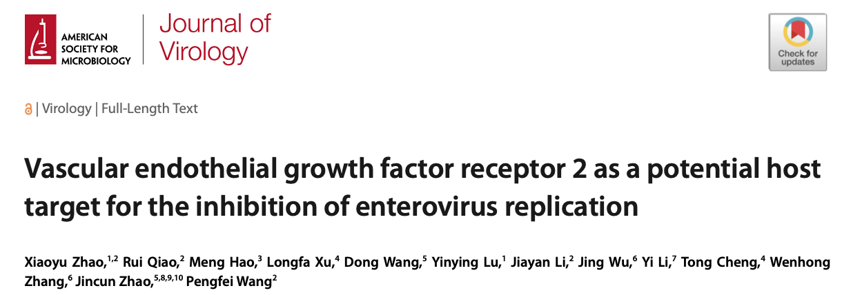 宿主蛋白激酶介导的细胞信号传导在许多病原体的复制和繁殖中发挥重要作用。先前黑料社 王鹏飞团队和香港大学周婕团队合作于Journal of Medical Virology在线发表了题为 “Rock1 is a novel host dependency factor of human enterovirus A71: implication as a drug target”的研究论文,揭示了Rock1是EV-A71复制的新型宿主依赖因子,可作为开发抗EV-A71疗法的靶标。近日,黑料社 的王鹏飞/赵晓宇团队在国际学术期刊Journal of Virology上发表题为“Vascular endothelial growth factor receptor 2 as a potential host target for the inhibition of enterovirus replication”的研究论文,发现帕唑帕尼(Pazopanib)具有广谱抗肠道病毒的作用,并揭示VEGFR2可能是肠道病毒复制的潜在宿主依赖因子,可作为开发抗肠道病毒疗法的靶标。