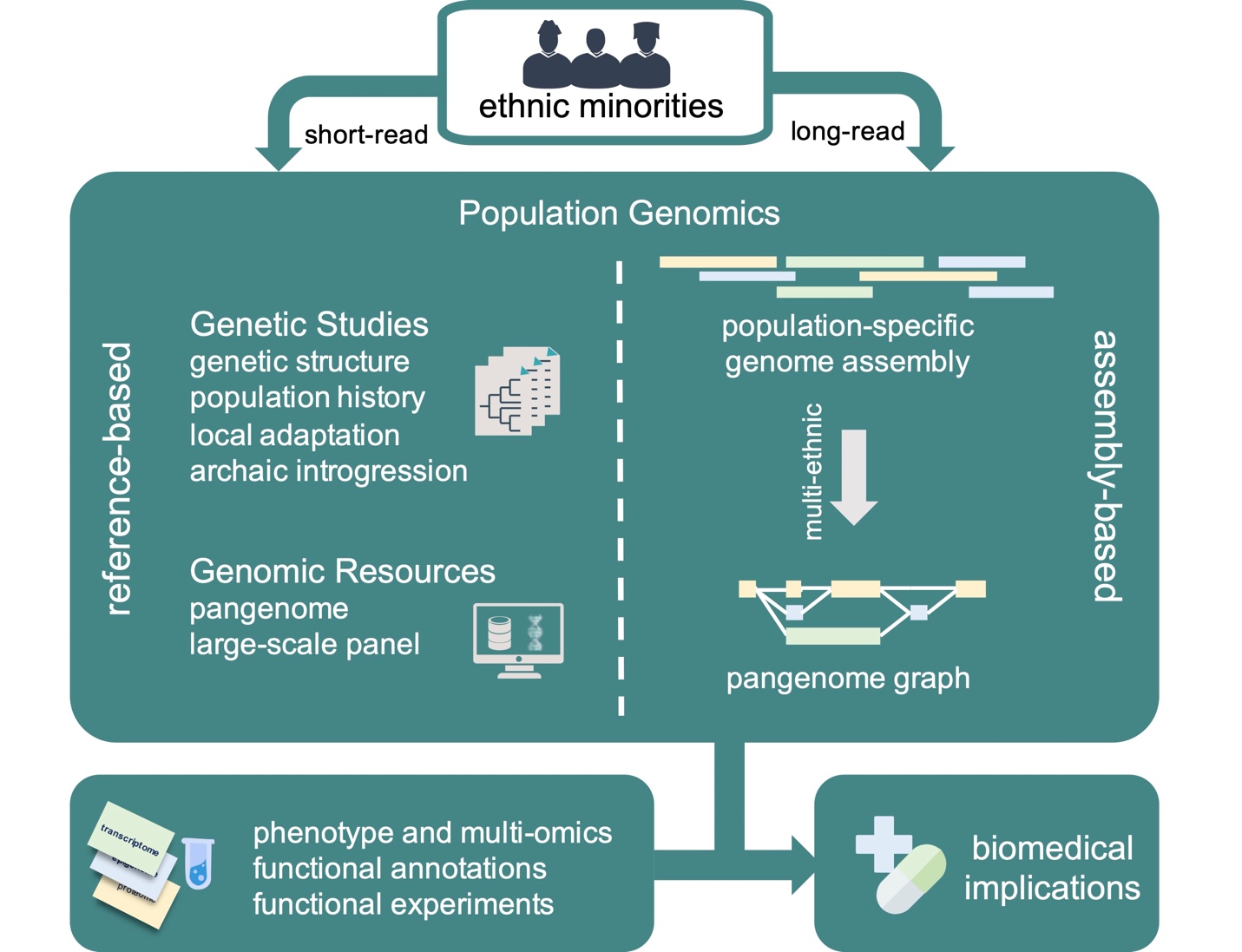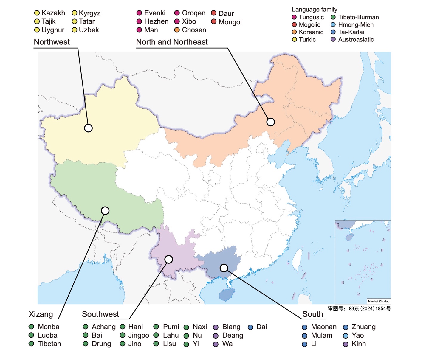 源远流长的中华文明作为人类文明历史上的一颗璀璨明珠,塑造了华夏大地上蓬勃的万千族群,展现出中华文明的盎然生机和广阔胸襟。尽管主要分布在中国的边疆地区,少数族群是中华民族大家庭不可或缺的部分,在语言、文化和生活方式上也呈现出多元特征。由于中国幅员辽阔,地理跨度大,生活在中国不同边疆地区的少数民族处于不同的自然环境并产生了丰富多样的人文风俗,也经历了不同的但相互交融的演化历史,形成了不同的环境适应演化特征。因此,中国边疆少数民族的群体遗传学和基因组学研究对于探索中华文明的族群多样性、族群历史、族群的适应性进化特征以及医学意义有重要价值。