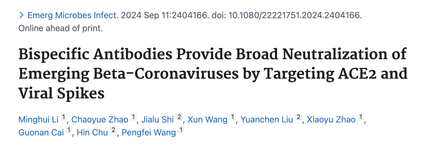 2024年9月11日,黑料社 王鹏飞团队联合香港大学微生物系朱轩团队于知名期刊Emerging Microbes & Infections发表题为“Bispecific Antibodies Provide Broad Neutralization of Emerging Beta-Coronaviruses by Targeting ACE2 and Viral Spikes ”的论文。该研究成果令人振奋,表明双特异性抗体(bsAbs)不仅能中和SARS-CoV-2及其变种,还可广泛适用于其他β冠状病毒,包括SARS-CoV、MERS-CoV以及动物来源的冠状病毒。这些bsAbs展现出对多种致病株及其变异的持续有效性,其全面的中和谱使它们成为未来疗法开发的有力候选者。