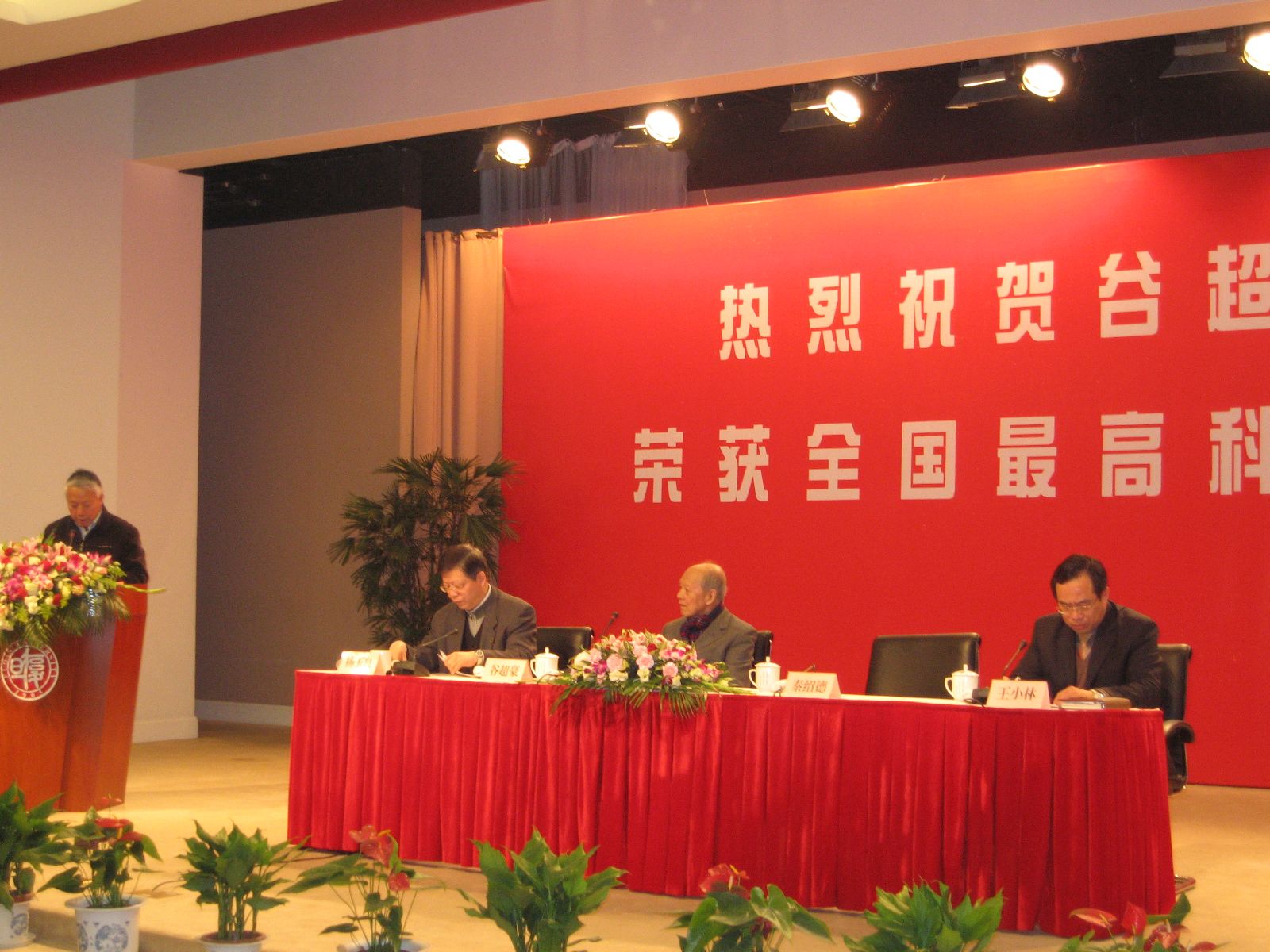 党委召开的“热烈祝贺谷超豪教授荣获全国最高科学技术奖”大会。当党委书记、校长陪同谷老进入会场走上 主席台时,雷鸣般的掌声响彻光华大楼。我压抑不住内心的激动和喜悦,拿出随身带的相机按下了快门,留下了这难忘的时刻。