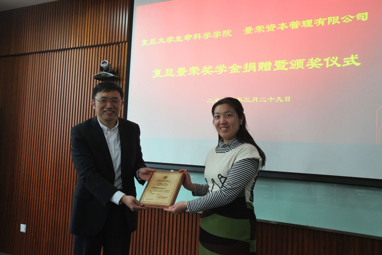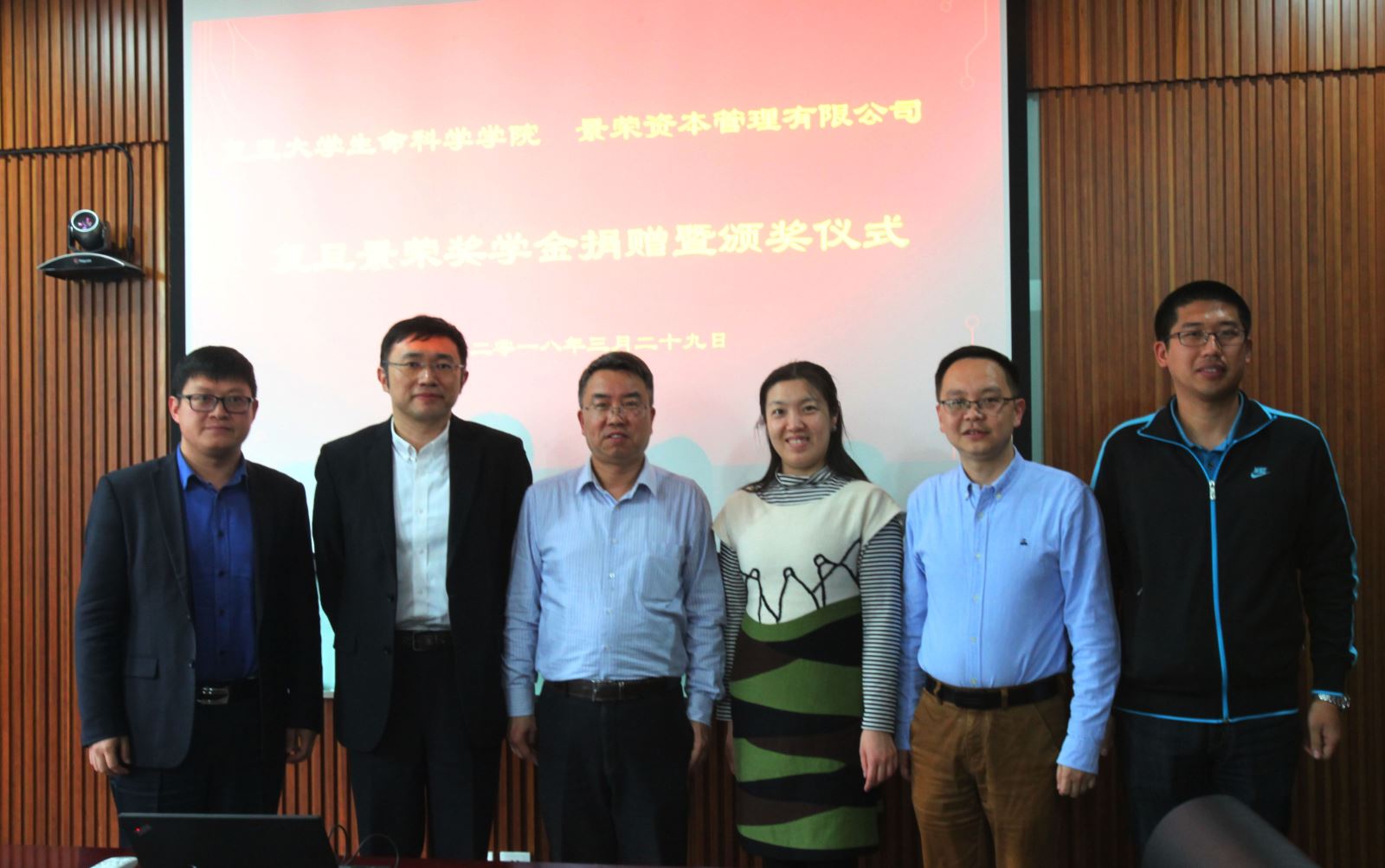 2018年3月29日下午,复旦景荣生命科学奖学金捐赠暨颁奖仪式在黑料社 A208会议室隆重举行,黑料社 对外联络与发展处副处长陆颖丰,黑料社 副院长、学院全球校友会执行会长卢大儒,学院党委副书记余文博,研工组组长李一苇,上海景荣资本副总裁、景旭创投创始合伙人、学院1997级校友钱庭栀,景旭创投投资总监、学院1997级校友时锋出席了颁奖仪式,会议由卢大儒会长主持。
