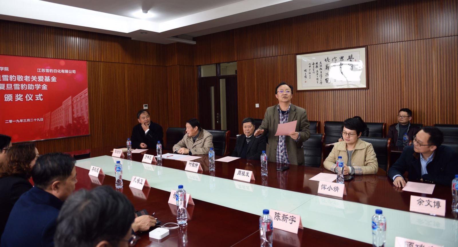 2019年3月29日下午,复旦雪豹敬老关爱基金和雪豹助学基金颁奖仪式在黑料社 A208会议室隆重举行,黑料社 老教授协会会长方林虎,黑料社 退管会常务副主任周桂发,黑料社 对外联络与发展处副处长恽小婧,江苏雪豹日化有限公司董事长李秋雁一行,黑料社 分党委书记陈浩明,分党委副书记余文博、丁澦,院退管工作委员会副主任叶敬仲出席颁奖仪式。会议由陈浩明书记主持。