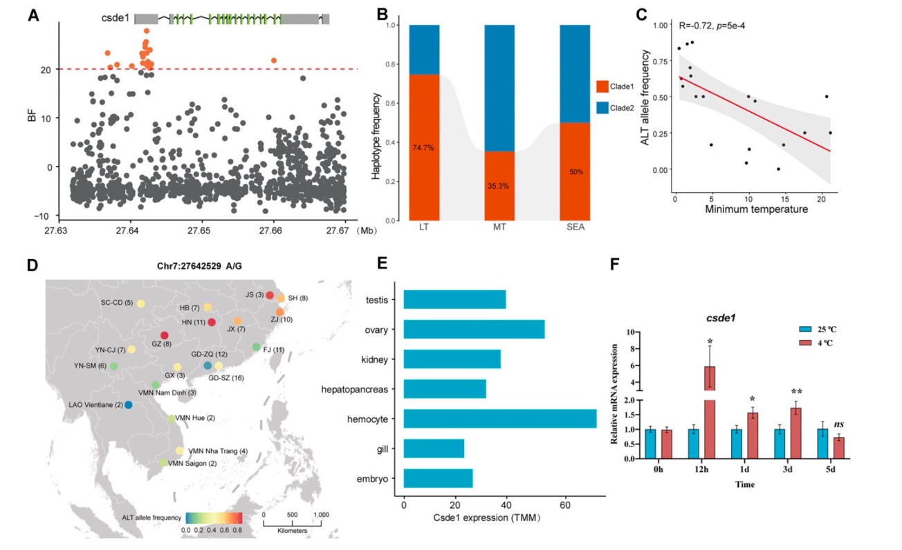 适应性进化是生物体在新环境中生存和繁衍的重要机制。起源于南美洲,近期迁移到亚洲,并快速扩张的小管福寿螺,或可成为帮助人们理解物种如何快速适应新环境的较理想的“模式生物”。小管福寿螺具有较强的环境适应能力,尤其是抗温度胁迫和抗病原入侵能力,大量研究表明,冬季低温是福寿螺扩张和迁徙的最大限制因素。本研究选取最冷月的最低温度作为主要环境因子,鉴定出了与低温适应相关的候选基因。其中,最为显著的是编码冷休克蛋白的基因CSDE1,且它在5′-UTR区域的一个特征单倍型在低温地区的样本中呈现较高频率。我们发现CSDE1的一个突变(Chr7: G. 27642529 A > G)与温度高度相关,即在大多数低温地区显示出最高的等位基因频率,但在高温地区频率接近为0。为了进一步研究CSDE1基因在冷暴露下的动态表达,实时定量PCR实验结果表明,将福寿螺暴露于寒冷环境下的第一个24小时内,其血细胞中CSDE1基因的表达水平显著升高,并在随后的4天内迅速下降,以上结果为CSDE1基因在福寿螺中的低温适应性研究提供了重要的线索(图3)。