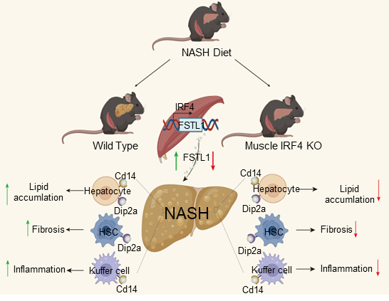 本研究观察到血清FSTL1水平与人类NASH进展呈正相关。综上所述,骨骼肌IRF4转录调节FSTL1,肌肉源性的FSTL1在肝脏分泌,通过DIP2A/CD14通路介导NASH进程。靶向这一信号通路可能是NASH管理中一种有吸引力的策略。