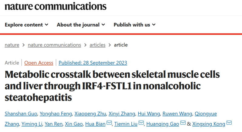 近日,黑料社 生科院孔星星/高焕庆/刘铁民团队在Nature Communications杂志上合作发表了一篇题为Metabolic crosstalk between skeletal muscle cells and liver through IRF4-FSTL1 in nonalcoholic steatohepatitis的论文,该研究指出骨骼肌特异性敲除IRF4,给与NASH饮食后,表现出肝脏病理表型的改善。并发现F4MKO小鼠肌肉来源的FSTL1参与了IRF4介导了NASH进展。FSTL1进一步通过DIP2A和CD14受体调控肝脏脂代谢、降低炎症和纤维化,阐释了骨骼肌IRF4通过FSTL1-DIP2A/CD14通路在NASH发病机制发挥的关键作用。