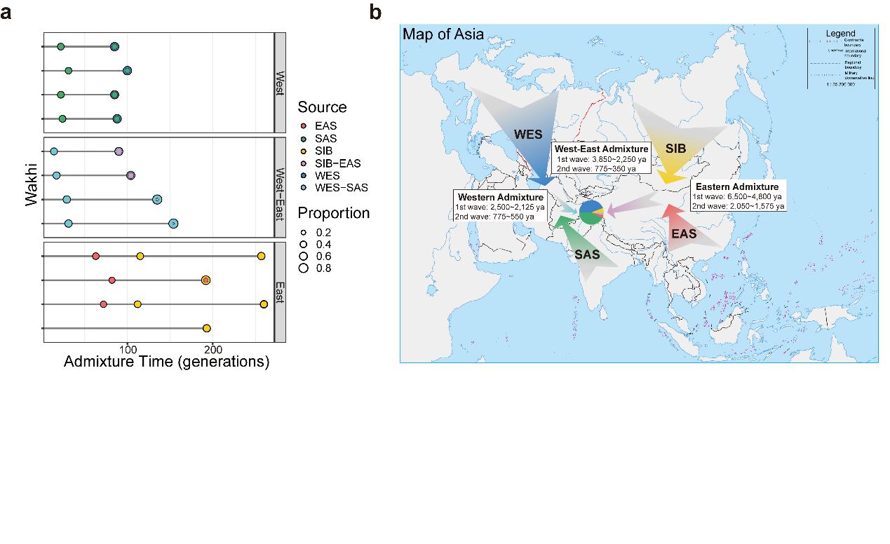 该研究进一步对瓦罕人的遗传融合历史进行推断,发现瓦罕人的演化经历了复杂的“混合之混合”的模式,即早期西欧和南亚祖先人群之间发生了基因交流,东亚和西伯利亚祖先之间也发生基因交流。随后,来自西方已经混合的祖源人群与来自东方已经混合的祖源人群之间进一步发生了多次大规模遗传融合:早期的人群融合发生在约3850 ~2250 年前,而更近期的人群融合发生在大约775~350 年前,后经持续基因交流和融合最终形成了现今的瓦罕人(图2)。