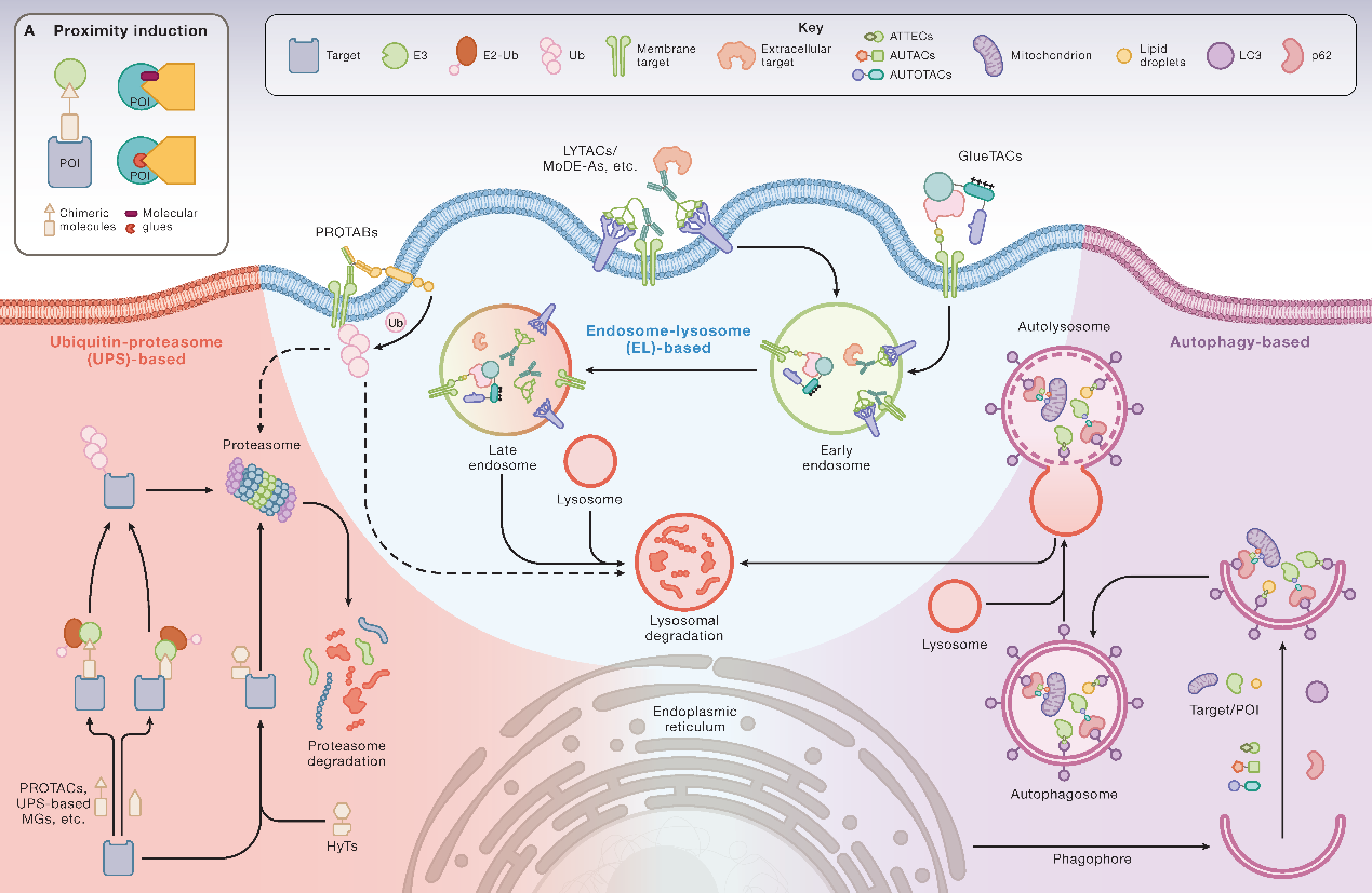 传统的抑制剂药物开发仅限于“可成药靶点”蛋白,即这些蛋白需要具备可被药物分子识别并结合的活性位点。然而,靶向蛋白降解(TPD)技术通过利用小分子化合物或大分子选择性地降解目标蛋白,从而突破了这一限制。TPD技术通过劫持细胞内的蛋白降解通路,使其适用靶标范围显著拓宽,为药物开发开辟了新途径。这些技术不仅有助于药物开发,还为研究特定蛋白的生理与病理功能提供了宝贵工具。