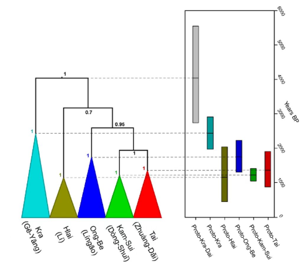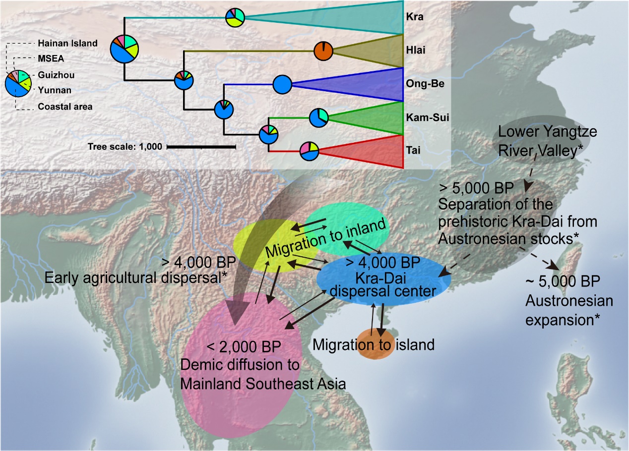 等多家单位,以侗台语历史演变为切入点,揭示了早期侗台语在约4000年前于中国南方沿海地区分化并向外传播的演化模式,该模式与史前侗台语人群的迁徙、农业扩张活动以及气候变化密切相关。该项工作为东亚及东南亚人类史前史问题的探索提供了一个重要的视角。