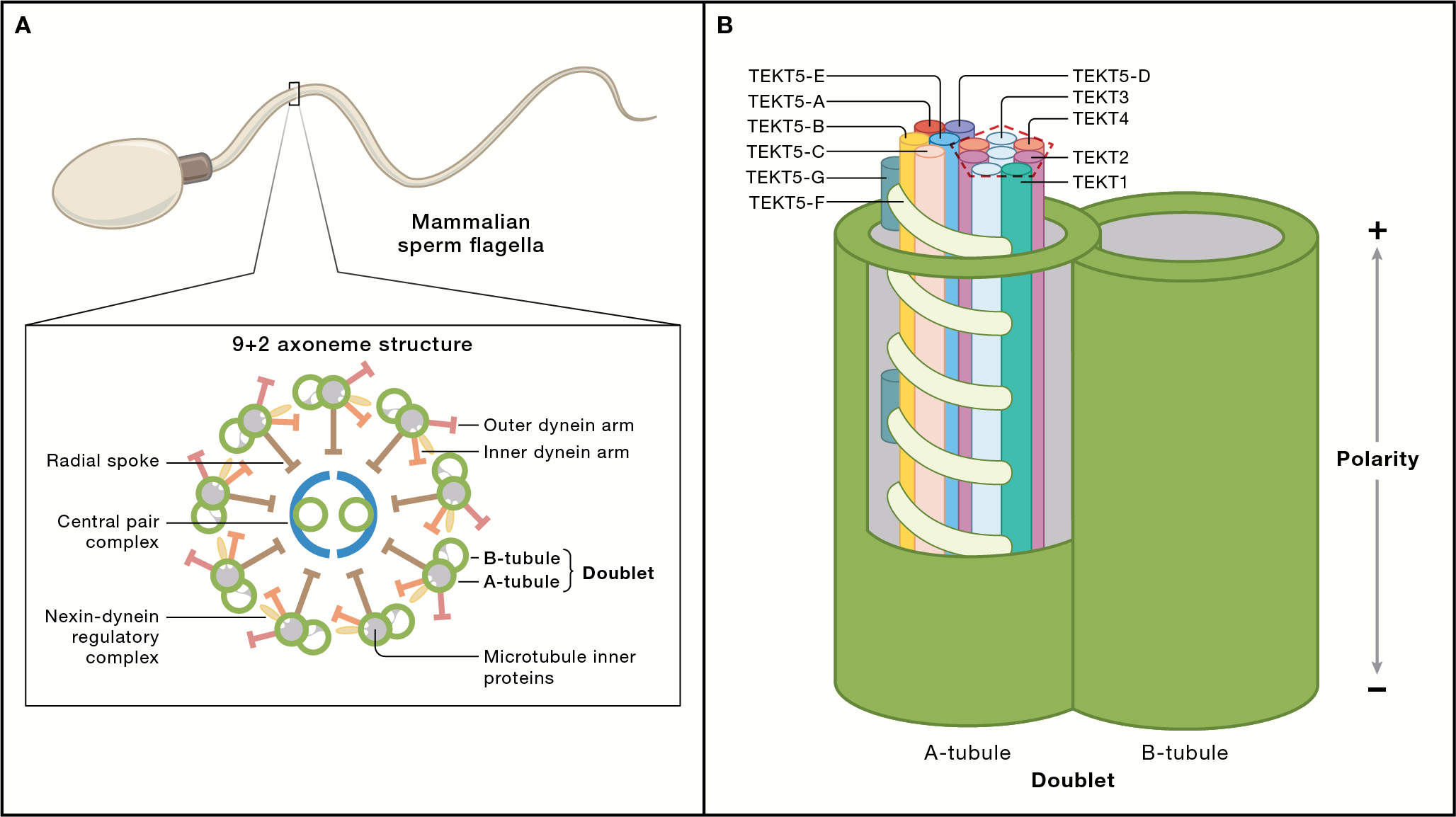 微管是一种在真核细胞中由微管蛋白组成的细胞骨架。细胞质中的微管由13排被称为原纤丝(Protofilament, PF)的微管蛋白组成,总体上形成内径15纳米,外径25纳米的管状结构。微管还是纤毛和鞭毛的结构基础。纤毛和鞭毛是真核细胞中的毛发状细胞器,具有多种功能。低等真核生物利用纤毛和鞭毛进行运动。在高等真核生物中,气管的上皮纤毛振动以清除粘液,而精子的鞭毛则推动其长距离移动以完成受精。纤毛和鞭毛中的微管结构与细胞质中的微管相比是独特的,因为它们被组织成二联微管(图1A)。二联微管由一个完整的具有13个PF的A管和一个不完整的具有10个PF的B管组成。最近,通过冷冻电子显微镜(cryo-EM)的单颗粒分析,二联微管的结构得到了高分辨率的分析。低等真核生物如纤毛虫的二联微管结构揭示了广泛的微管内部蛋白(Microtubule Inner Proteins, MIPs)网络,它们稳定而有规律地结合在二联微管的管蛋白晶格的内表面。Tektin是一个众所周知的与男性不育有关的二联微管成分,但它在二联微管结构中的定位却一直难以捉摸。这篇Preview文章介绍了最近获得的二联微管结构,并强调了不同物种的tektin束的差异。