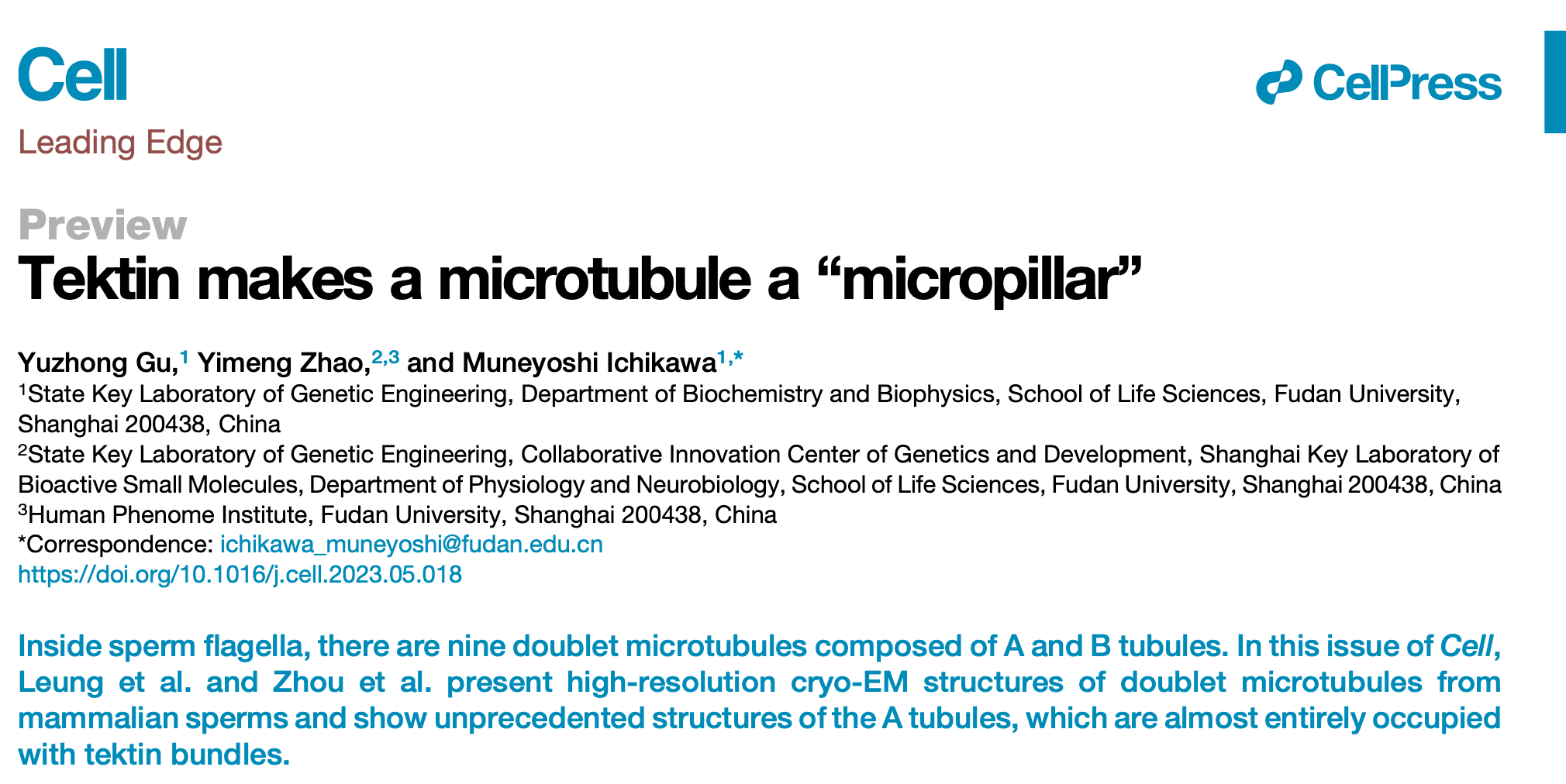 市川宗严青年研究员受邀在Cell《细胞》杂志上发表了题为《Tektin makes a microtubule a ‘micropillar》(《筑丝蛋白使得微管成为“微柱”》)的Preview文章。