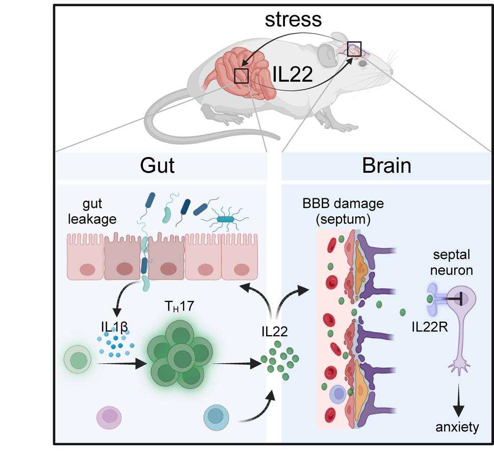 综上,该项研究阐述了在压力引起的免疫激活早期阶段,肠道TH17细胞增加并产生IL-22;IL-22可经破损的血脑屏障进入脑隔区直接抑制神经元激活,进而降低小鼠的压力应激性焦虑行为,从而揭示了压力应激诱导下的免疫激活早期阶段具有以前未被认识到的有益作用,可能是进化过程中机体保留应激性免疫系统激活的原因之一;同时也揭示了免疫系统在抵御精神疾病方面的积极作用。此外,该项工作也探究了IL-22对降低抑郁行为的效应,为利用IL-22治疗压力相关精神疾病提供新的思路。