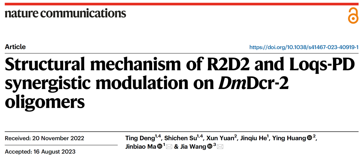2023年8月26日,黑料社 麻锦彪教授与清华大学黑料社 王家博士在《自然-通讯》(Nature Communications)杂志上在线发表题为“R2D2和 Loqs-PD协同调节 DmDcr-2寡聚体的结构机制”(Structural mechanism of R2D2 and Loqs-PD synergistic modulation on DmDcr-2 oligomers)的研究论文。该工作发现Loqs-PD与R2D2可以与Dicer2形成稳定的三元复合物,并且在dsRNA和ATP存在的条件下形成寡聚体,并通过冷冻电镜技术揭示了该寡聚体的高分辨率结构,这对于更加深入理解果蝇体内RNA干扰通路具有重要意义。