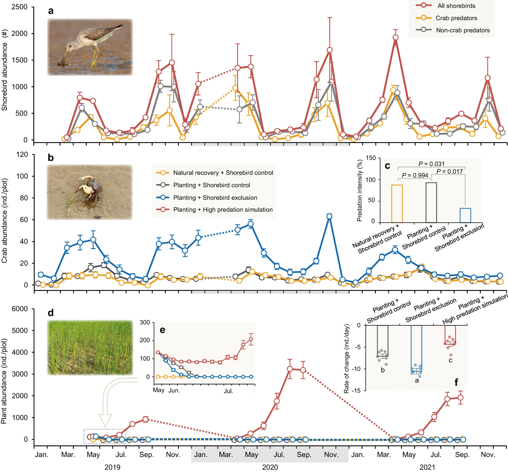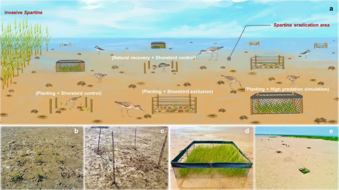 通过开展多年度连续监测,研究首先发现,以滨鸟为主的水鸟通过营养级联显著促进滨海湿地植被的恢复。在长江口崇明东滩潮间带互花米草治理区,自然恢复未能使土著植物海三棱藨草定殖和恢复。按常规种植密度种植的海三棱藨草,由于植食性蟹类的啃食,同样未能成功定殖。排除水鸟以模拟水鸟种群的持续丧失,由于降低了水鸟对植食性蟹类的捕食作用而引发植食性蟹类的季节性爆发,加剧了种植的海三棱藨草的消亡。相反,排除植食性蟹类模拟水鸟种群丧失前的高强度捕食作用,可使种植的海三棱藨草得以成功定殖和恢复(图3)。