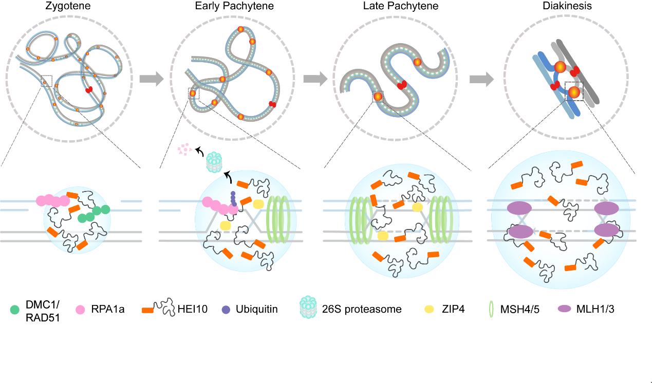 随着对减数分裂过程的进一步认知,研究发现真核生物减数分裂普遍产生两类CO:干涉敏感型(I型)和干涉不敏感型(II型),其在染色体上的数目和分布受到严格的调控。已报到的大部分生物减数分裂产生的主要是I型CO,受到一类保守的ZMM蛋白(Zip1、Zip2、Zip3、Zip4、Msh4、Msh5和Mer3)及MLH1/3调控。植物HEI10是酵母Zip3的同源蛋白,其突变导致I型CO缺失。因其可以特异地在I型CO形成的位置定位,也被作为动植物中I型CO的主要标志物。小鼠和拟南芥中的证据都表明HEI10的量与I型CO的数目正相关,其作用机制不清楚。HEI10蛋白质最显著的结构特征是具有N端保守的RING结构域,可能作为E3泛素连接酶发挥功能,但其直接的底物也仍然不清楚。